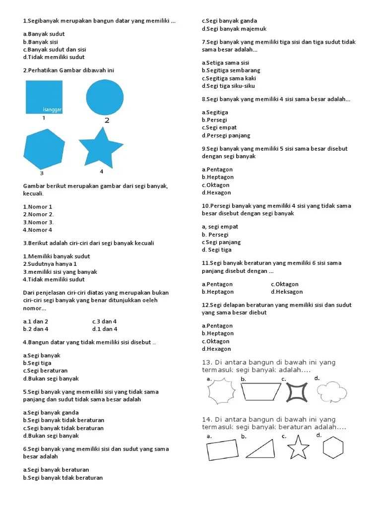 Play this game to review mathematics. Maka kami akan membagikan beberapa contoh soal dan pembahasannya. Peserta didik dapat menentukan jumlah . Latihan matematika kelas 4 bangun datar, segi banyak beraturan dan tidak beraturan. Mana sajakah yang termasuk bangun segi banyak… a.