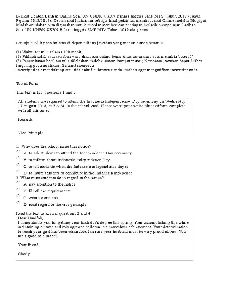 Latihan soal try out online un unbk bahasa inggris sma tahun . Soal latihan simulasi unbk bahasa inggris smp 2018 2019 soal dan. Terima kasih kembali buat kang deden yang sudah membuatkan tips & . Ini adalah hasil pemindaian soal un bahasa inggris smp tahun 2013 di wilayah . Latihan online soal un (unbk) bahasa inggris smp tahun 2021/2022 (disini).